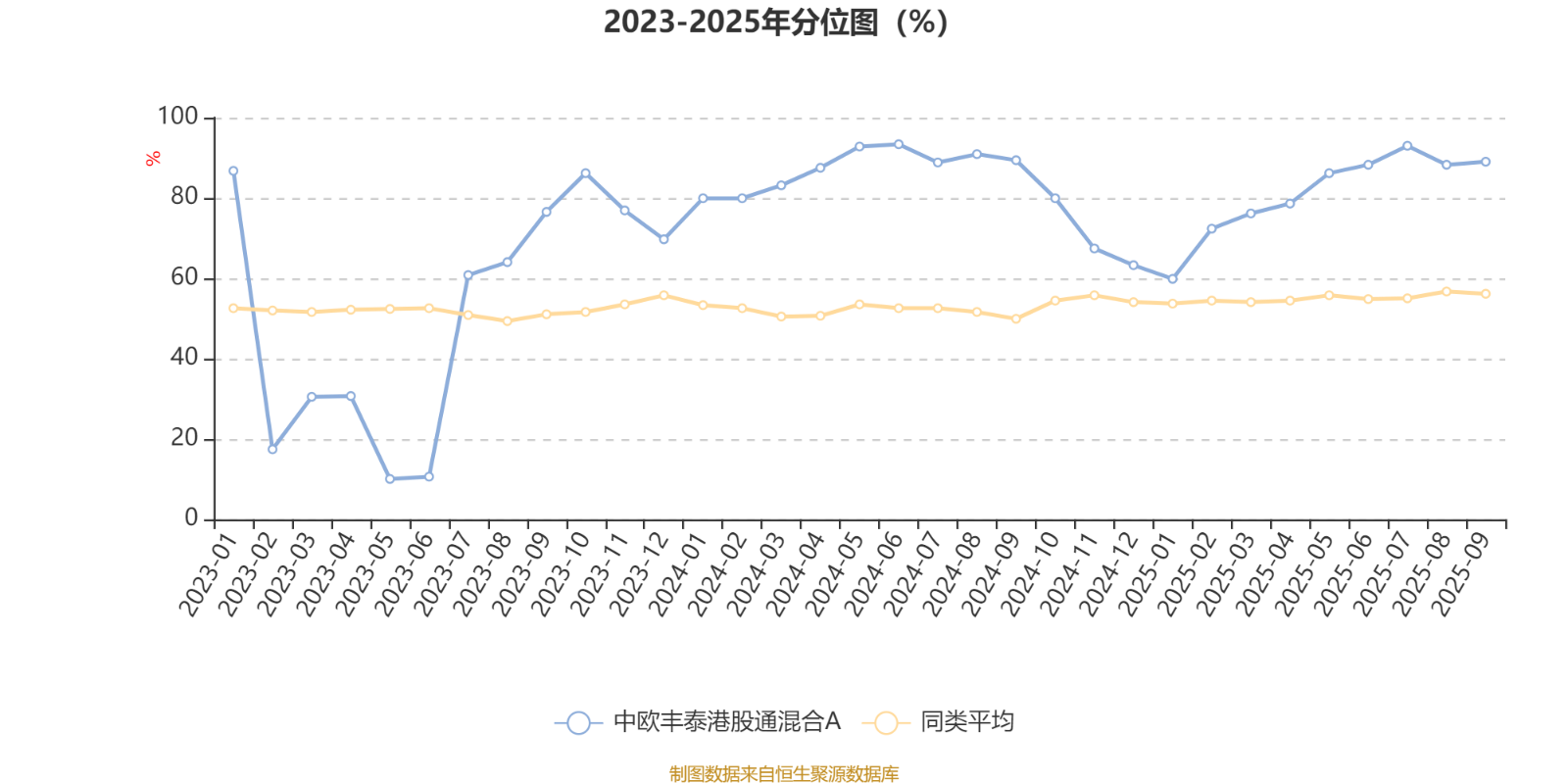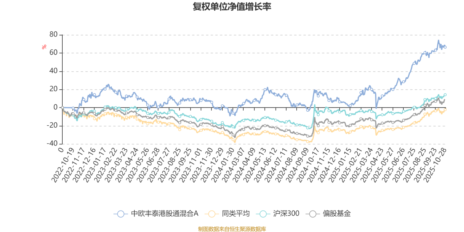 截至10月28日,中欧丰泰港股通混合A近三个月复权单位净值增长率为11.29%,位于同类可比基金385/621;近半年复权单位净值增长率为47.69%,位于同类可比基金94/619;近一年复权单位净值增长率为43.49%,位于同类可比基金146/611;近三年复权单位净值增长率为75.48%,位于同类可比基金28/518。