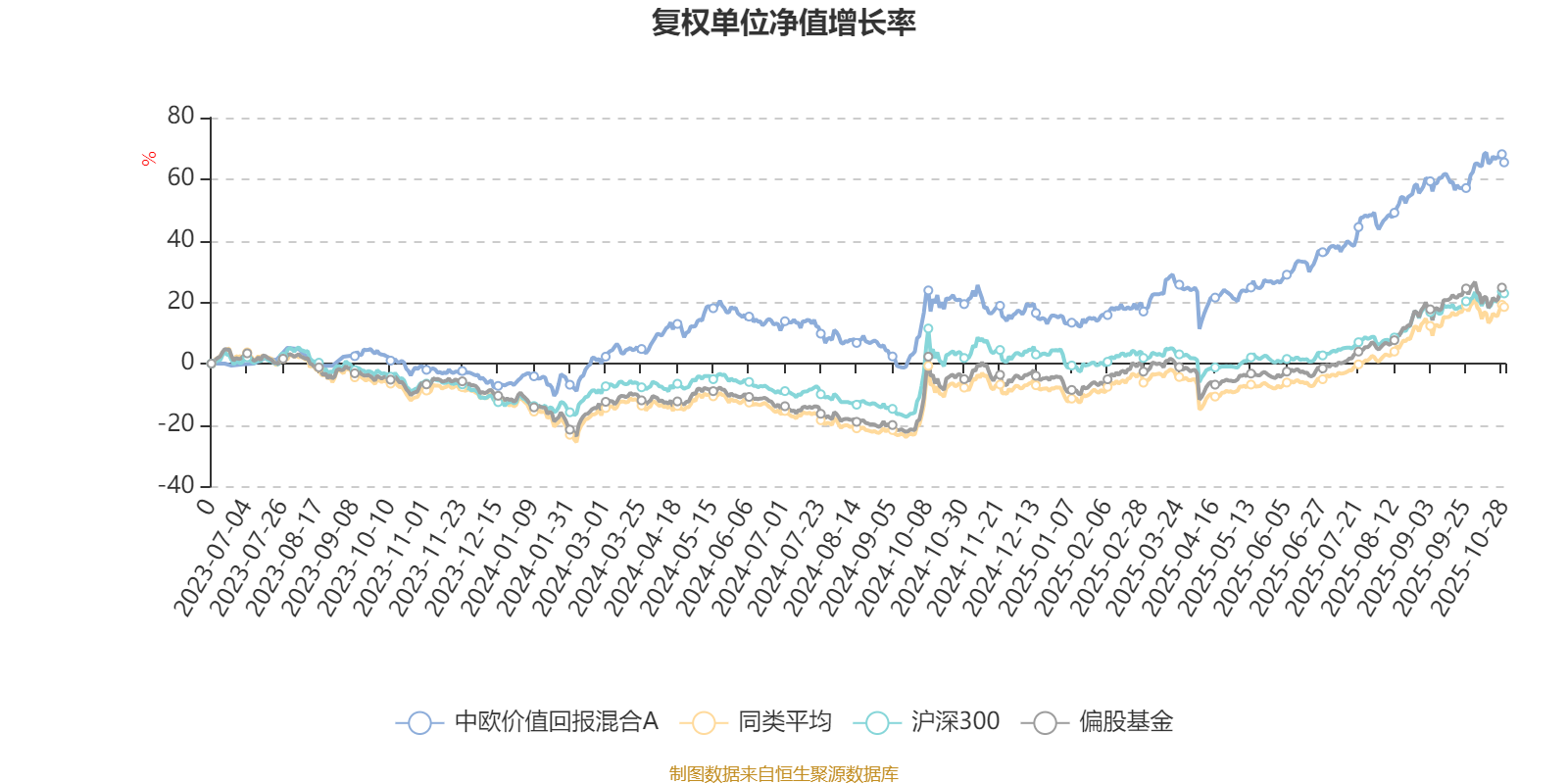 截至10月28日,中欧价值回报混合A近三个月复权单位净值增长率为11.54%,位于同类可比基金114/185;近半年复权单位净值增长率为36.49%,位于同类可比基金59/185;近一年复权单位净值增长率为36.87%,位于同类可比基金54/181。
