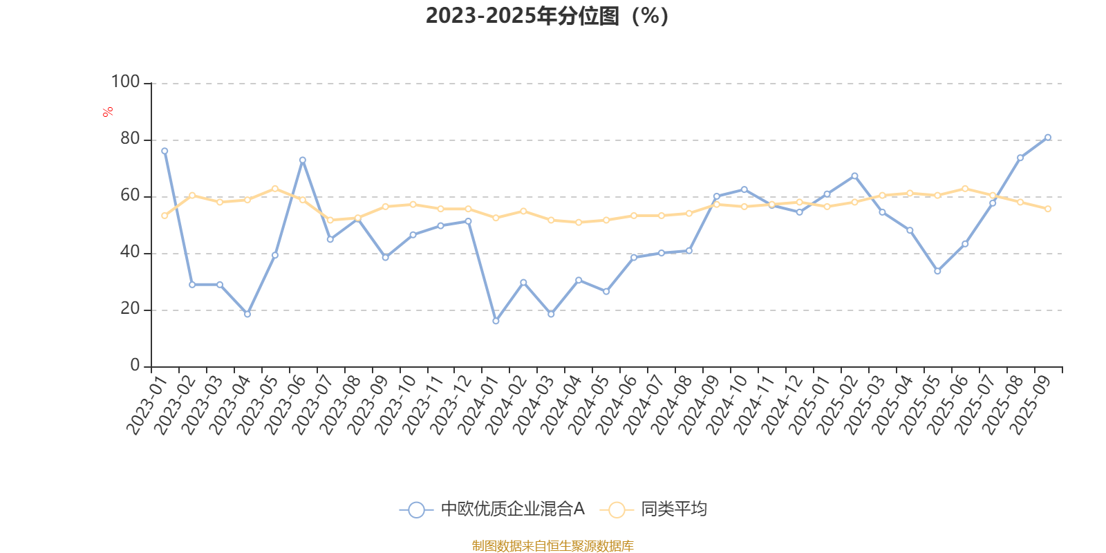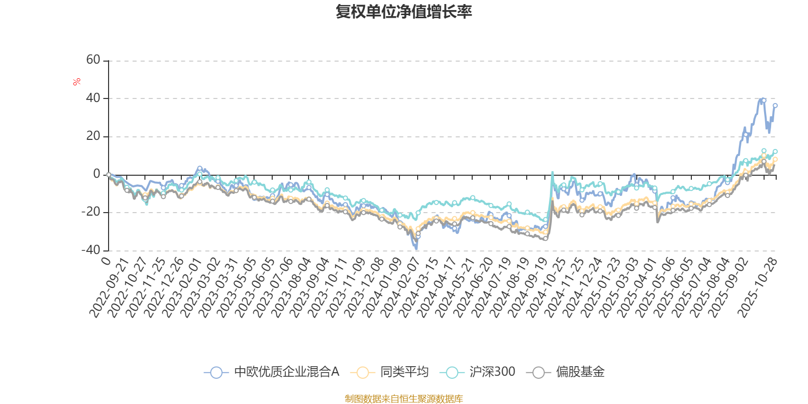 截至10月28日,中欧优质企业混合A近三个月复权单位净值增长率为41.21%,位于同类可比基金8/130;近半年复权单位净值增长率为61.59%,位于同类可比基金14/130;近一年复权单位净值增长率为48.33%,位于同类可比基金24/130;近三年复权单位净值增长率为49.01%,位于同类可比基金26/124。