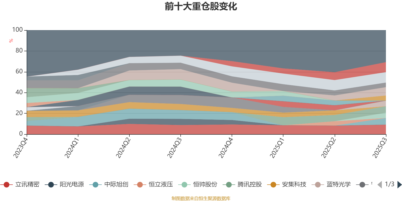 该基金持股集中度较高。截至2025年三季度末,基金十大重仓股分别是小鹏汽车-W、高伟电子、立讯精密、新易盛、中际旭创、腾讯控股、蓝特光学、恒帅股份、九方智投控股、双环传动。
