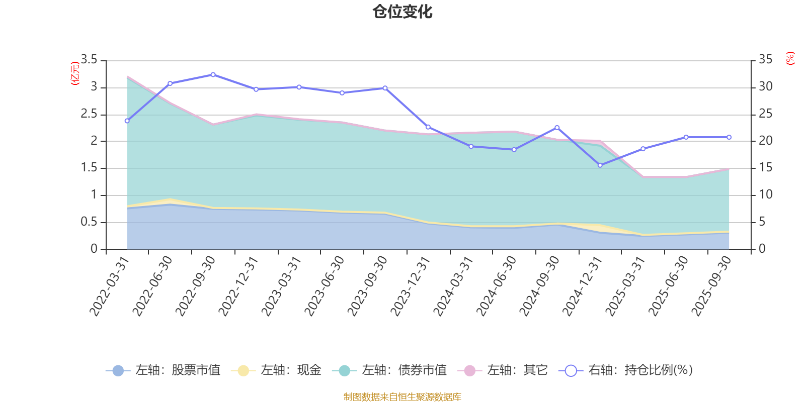 据定期报告数据统计,近三年平均股票仓位为23.09%,同类平均为19.14%。2022年三季度末基金达到32.35%的最高仓位,2024年末最低,为15.59%。