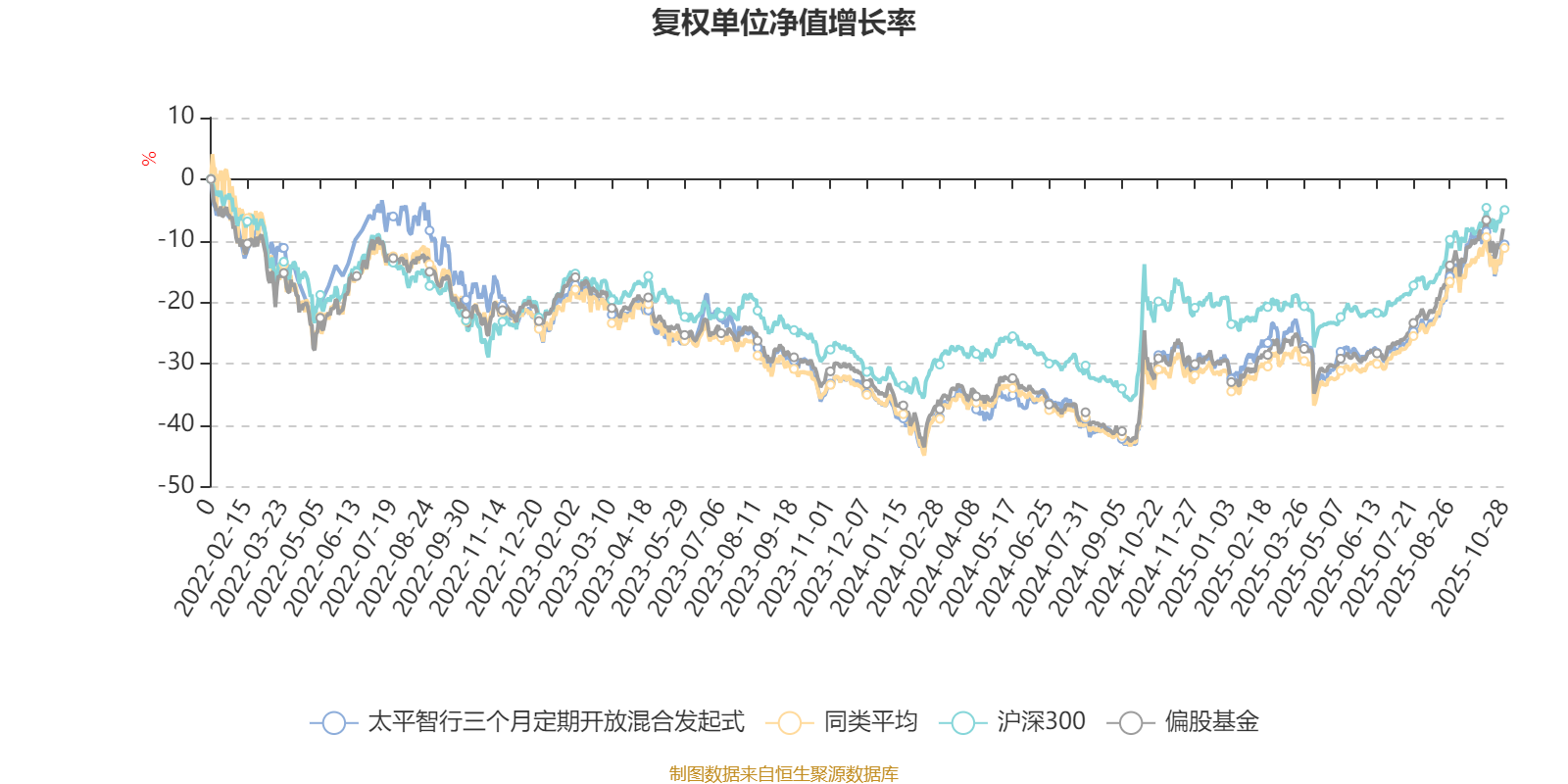 截至10月28日,太平智行三个月定期开放混合发起式近三个月复权单位净值增长率为17.20%,位于同类可比基金102/265;近半年复权单位净值增长率为28.98%,位于同类可比基金131/265;近一年复权单位净值增长率为24.38%,位于同类可比基金148/265;近三年复权单位净值增长率为12.54%,位于同类可比基金159/253。
