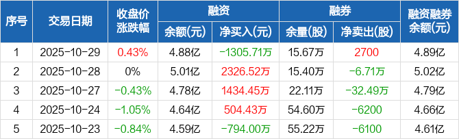 融资方面,当日融资买入2697.01万元,融资偿还4002.72万元,融资净偿还1305.71万元。融券方面,融券卖出1.39万股,融券偿还1.12万股,融券余量15.67万股,融券余额73.49万元。融资融券余额合计4.89亿元。