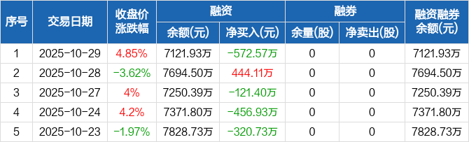 德龙激光:融资净偿还572.57万元,融资余额7121.93万元(10-29)