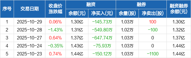 融资方面,当日融资买入509.07万元,融资偿还654.8万元,融资净偿还145.73万元,连续5日净偿还累计1569.33万元。融券方面,融券卖出100股,融券偿还0股,融券余量1.03万股,融券余额34.9万元。融资融券余额合计1.3亿元。