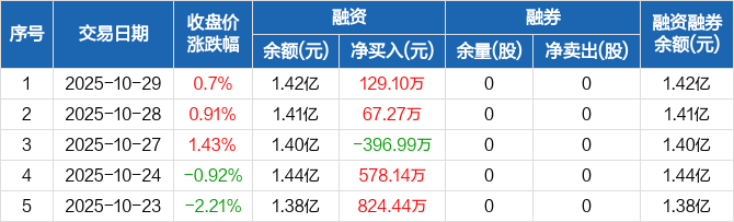融资方面,当日融资买入1467.42万元,融资偿还1338.32万元,融资净买入129.1万元。融券方面,融券卖出0股,融券偿还0股,融券余量0股,融券余额0元。融资融券余额合计1.42亿元。