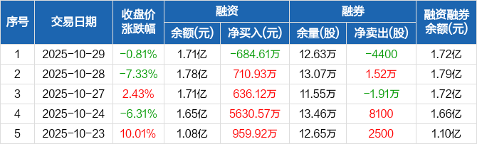 融资方面,当日融资买入1.03亿元,融资偿还1.09亿元,融资净偿还684.61万元。融券方面,融券卖出100股,融券偿还4500股,融券余量12.63万股,融券余额107.73万元。融资融券余额合计1.72亿元。