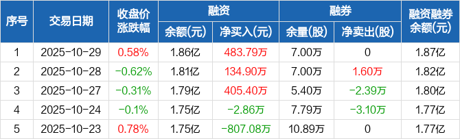 融资方面,当日融资买入1213.84万元,融资偿还730.05万元,融资净买入483.79万元,连续3日净买入累计1024.1万元。融券方面,融券卖出0股,融券偿还0股,融券余量7万股,融券余额134.4万元。融资融券余额合计1.87亿元。