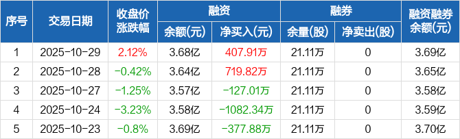 融资方面,当日融资买入5835万元,融资偿还5427.1万元,融资净买入407.91万元。融券方面,融券卖出0股,融券偿还0股,融券余量21.11万股,融券余额50.88万元。融资融券余额合计3.69亿元。