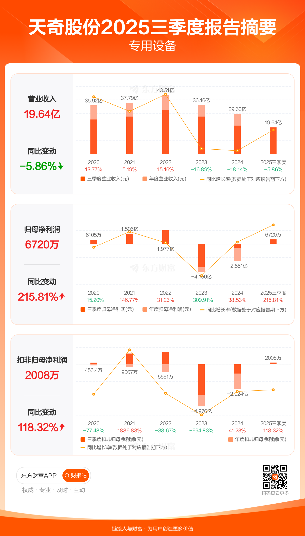 天奇股份10月25日发布2025年三季报显示,公司前三季实现营业收入19.64亿元,同比下滑5.86%;归母净利润6719.96万元,同比增长215.81%;扣非归母净利润2008.26万元,同比增长118.32%