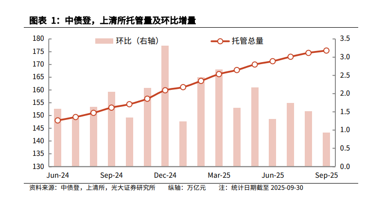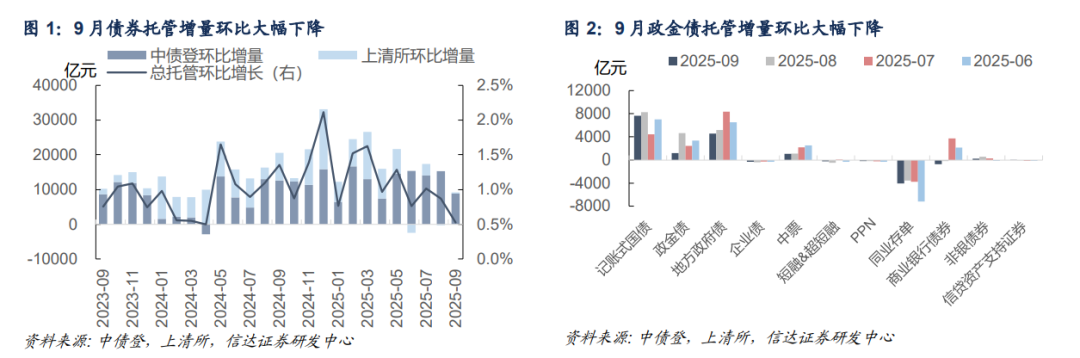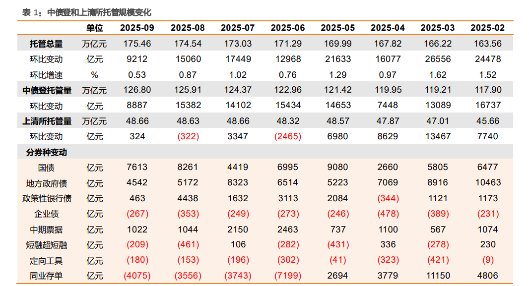 债券托管总量环比少增。截至2025年9月末,中债登和上清所的债券托管量合计为175.46万亿元,环比净增加0.92万亿元,较8月末环比少增0.58万亿元。利率债、信用债托管总量环比净增,金融债、同业存单托管总量环比净减。本月配置盘主要券种托管总量环比续增,交易盘和境外机构托管总量环比续减:政策性银行、商业银行增持利率债和信用债,减持同业存单。