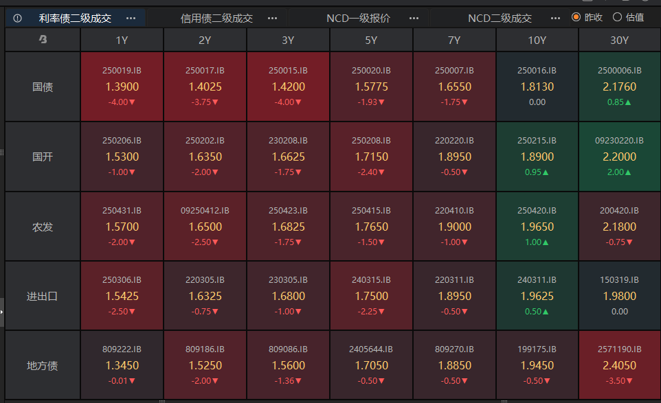 截至今日18点,利率市场收益率多数大幅下行,1Y国债下行4bp至1.39%,3Y国债下行4bp至1.42%,5Y国债下行1.93bp至1.58%,10Y国债收益率持平至1.81%,30Y国债上行0.85bp至2.18%,10Y国开上行0.95bp至1.89%。信用市场收益率多数下行,2Y期AAA信用债下行2.5bp至1.74%,3Y期AAA信用债下行0.91bp至1.97%,5Y期AAA信用债下行0.25bp至2.17%。转债方面,中证转债指数今日收盘报489点,收涨0.96%。