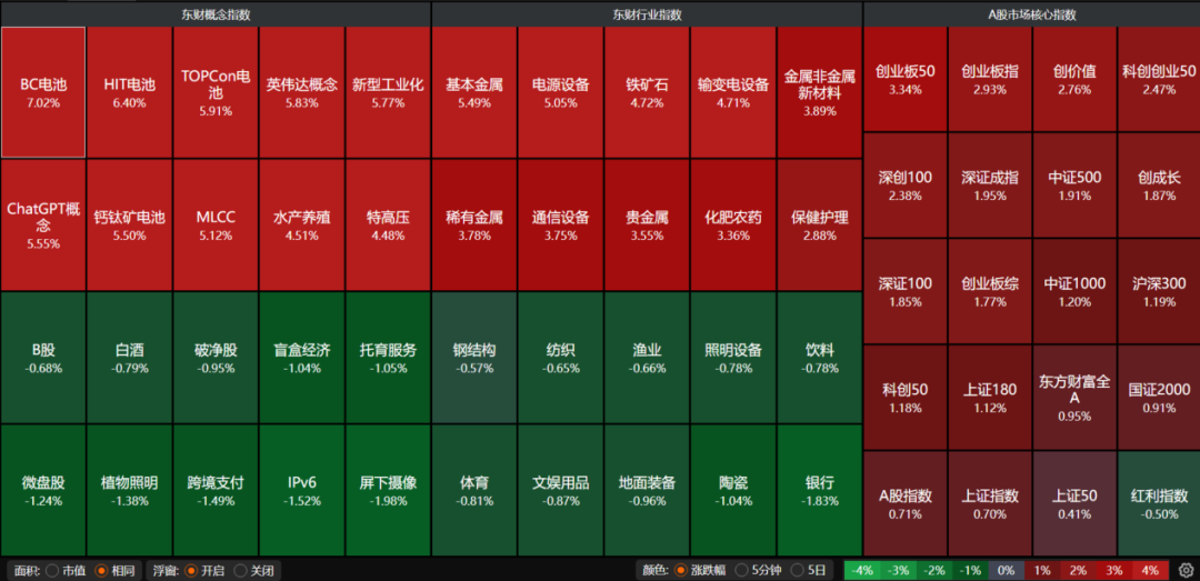 昨日A股三大指数集体上涨,沪指涨0.70%,站上4000点大关;深证成指涨1.95%,创业板指涨2.93%,北证50指数涨8.41%。沪深京三市成交额接近2.3万亿。行业板块涨多跌少,能源金属、光伏设备、有色金属、非金属材料、贵金属、小金属、电池、玻璃玻纤、多元金融、证券板块涨幅居前,银行、船舶制造板块跌幅居前。