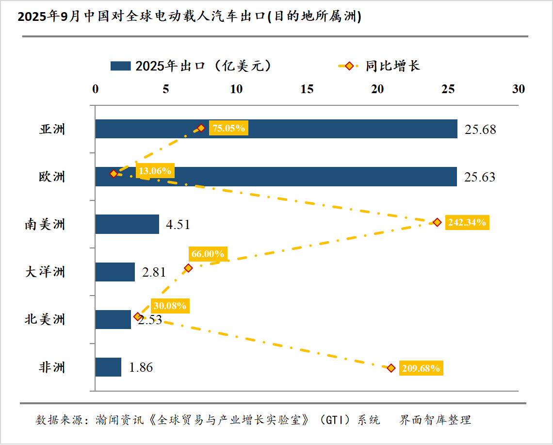 同时,新兴市场成为拉动出口增长的关键引擎,展现出 “高增速、强潜力” 的特点。非洲市场延续此前的强劲增势,9 月出口额同比激增 209.68%,市场需求释放速度加快;南美洲则成为当月各大洲中的 “最大亮点”,出口额同比增幅高达 242.34%,增速位列所有大洲首位。这两大新兴市场的爆发式增长,不仅反映出当地对新能源汽车的需求进入快速上升期,也体现出中国电动载人汽车在性价比、适配性等方面的优势,正快速打开新兴市场空间,逐步成为中国电动载人汽车出口的新增长极。