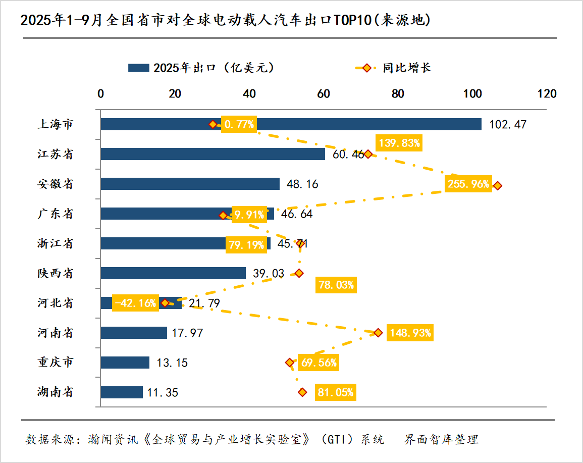 1-9月,上海市以102.47亿美元的出口额继续领跑全国电动载人汽车出口,但同比小幅下滑0.77%。江苏省以60.46亿美元稳居第二,同比实现139.83%的爆发式增长。安徽省位列第三,出口额为48.16亿美元,同比增长255.96%。1-9月TOP10来源地出口金额合计达406.72亿美元,占全国电动载人汽车总出口额的85.83%,头部省市的主导格局稳固。