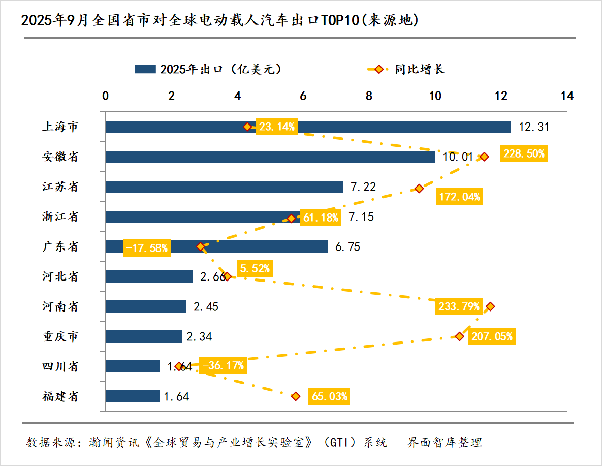 与8月相比,9月电动载人汽车出口前十大来源地格局总体稳定。上海市以12.31亿美元的出口额稳居榜首,与安徽省、江苏省共同构成第一梯队。福建省本期新晋入围,而陕西省则跌出前十行列。