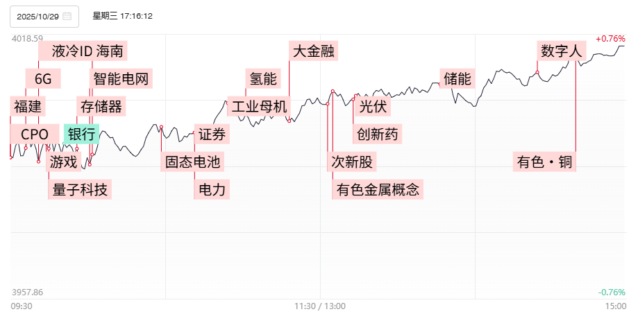 财联社10月30日电,上个交易日市场全天震荡拉升,三大指数高开高走,创业板指涨近3%创年内新高,沪指再度回升至4000点上方,北证50指数涨超8%。沪深两市成交额2.26万亿,较前日放量1082亿。1)10月28日,英伟达CEO黄仁勋于年度第二次GTC大会发表主旨演讲,预计未来六个季度数据中心业务规模将达5000亿美元,受此提振算力硬件股早盘大面积冲高后展开分化,服务器代工龙头工业富联总市值突破1.6万亿续创历史新高,鼎泰高科、生益电子、中钨高新等M9材料产业链方向继续领涨的同时,“易中天”三大光模块龙头股盘中回落一度翻绿,液冷服务器、SST电源等受益Rubin全液冷架构推广的细分也迎来强修复,整体仍处于内部高低切轮动态势。2)储能龙头股阳光电源发布2025年三季报,前三季度实现净利润同比增超56%,超出去年全年水平,光伏、储能概念全天表现强势,阳光电源涨超15%,总市值逼近4000亿。而午后阿特斯、隆基绿能、通威股份等多只光伏概念股涨停。3)本周力拓宣布旗下澳洲铝厂因无法获得低价电力,可能会在2028年底当前合同到期后停产。电解铝概念股集体爆发,中孚实业、南山铝业涨停,云铝股份、神火股份盘中创出历史新高。4)“十五五”规划相关新经济方向盘中展开高速轮转,其中位居新经济内容首位的量子科技概念继续得到热捧,但仅有天融信、神州信息两只低位股上板,格尔软件、德美化工等抱团人气股盘中遭遇放量炸板,另一大人气方向可控核聚变概念人气股中国核建股价也在涨停附近激烈争夺。而生物制造、6G等前期滞涨方向中诺思格、本川智能两只20厘米个股涨停的同时,其余后排品种整体表现并不尽人意。