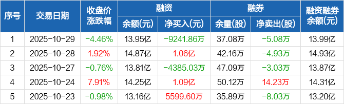 融资方面,当日融资买入3.69亿元,融资偿还4.62亿元,融资净偿还9241.86万元。融券方面,融券卖出3.76万股,融券偿还8.84万股,融券余量37.08万股,融券余额469.06万元。融资融券余额合计13.99亿元。