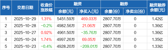 融资方面,当日融资买入948.69万元,融资偿还479.66万元,融资净买入469.03万元。融券方面,融券卖出0份,融券偿还0份,融券余量2807.7万份,融券余额8715.1万元。融资融券余额合计1.42亿元。