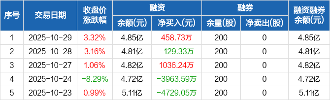 融资方面,当日融资买入6991.89万元,融资偿还6533.16万元,融资净买入458.73万元。融券方面,融券卖出0股,融券偿还0股,融券余量200股,融券余额810元。融资融券余额合计4.85亿元。