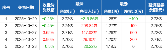 融资方面,当日融资买入810.38万元,融资偿还1027.24万元,融资净偿还216.86万元。融券方面,融券卖出300股,融券偿还400股,融券余量1.26万股,融券余额93.87万元。融资融券余额合计2.73亿元。
