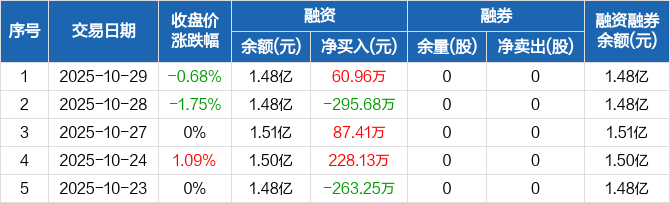 融资方面,当日融资买入930.33万元,融资偿还869.37万元,融资净买入60.96万元。融券方面,融券卖出0股,融券偿还0股,融券余量0股,融券余额0元。融资融券余额合计1.48亿元。