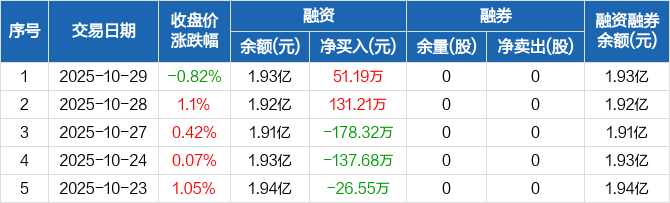 融资方面,当日融资买入710.61万元,融资偿还659.42万元,融资净买入51.19万元。融券方面,融券卖出0股,融券偿还0股,融券余量0股,融券余额0元。融资融券余额合计1.93亿元。