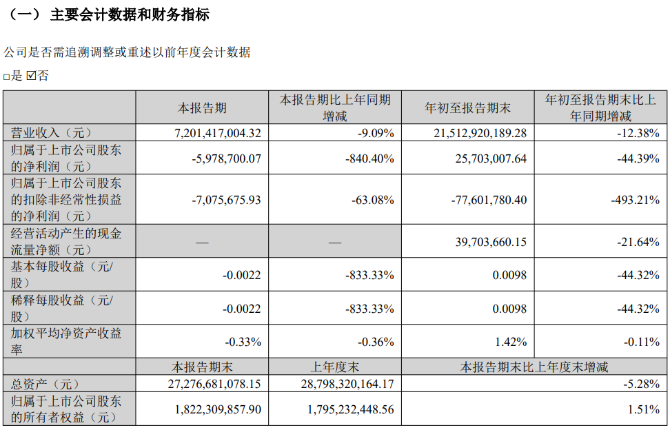 其中,第三季度实现营业收入72.01亿元,同比降低9.09%,归母净利润-597.87万元,同比降840.40%。