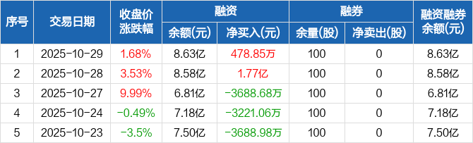 融资方面,当日融资买入2.82亿元,融资偿还2.78亿元,融资净买入478.85万元。融券方面,融券卖出0股,融券偿还0股,融券余量100股,融券余额2354元。融资融券余额合计8.63亿元。