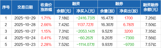 融资方面,当日融资买入9576.19万元,融资偿还1.2亿元,融资净偿还2416.73万元。融券方面,融券卖出3600股,融券偿还1900股,融券余量16.47万股,融券余额814.15万元。融资融券余额合计7.26亿元。