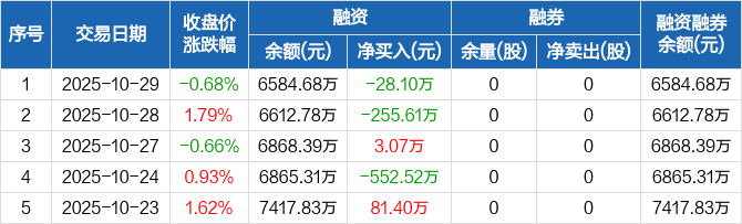 浙江恒威:融资净偿还28.1万元,融资余额6584.68万元(10-29)