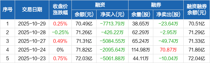 融资方面,当日融资买入3.38亿元,融资偿还4.15亿元,融资净偿还7713.79万元,连续7日净偿还累计2.95亿元。融券方面,融券卖出2300股,融券偿还23.87万股,融券余量38.65万股,融券余额157.31万元。融资融券余额合计70.51亿元。