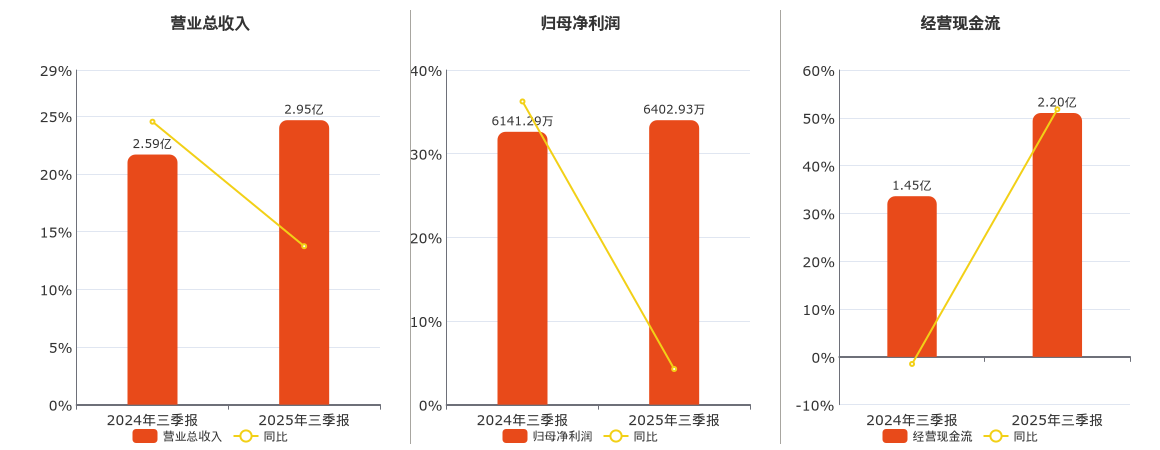 公司营业总收入为2.95亿元,较去年同报告期营业总收入增加3563.24万元,实现2年连续上涨,同比较去年同期上涨13.73%。归母净利润为6402.93万元,较去年同报告期归母净利润增加261.64万元,实现2年连续上涨,同比较去年同期上涨4.26%。经营活动现金净流入为2.20亿元,较去年同报告期经营活动现金净流入增加7498.39万元,同比较去年同期上涨51.78%。