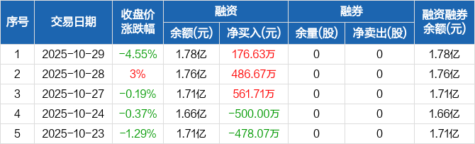 融资方面,当日融资买入1283.44万元,融资偿还1106.81万元,融资净买入176.63万元,连续3日净买入累计1225.02万元。融券方面,融券卖出0股,融券偿还0股,融券余量0股,融券余额0元。融资融券余额合计1.78亿元。