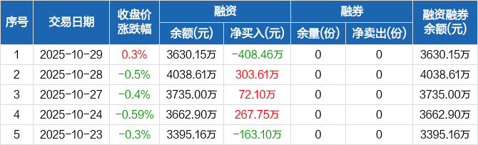 融资方面,当日融资买入402.48万元,融资偿还810.94万元,融资净偿还408.46万元。融券方面,融券卖出0份,融券偿还0份,融券余量0份,融券余额0元。融资融券余额合计3630.15万元。