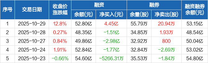 融资方面,当日融资买入18.42亿元,融资偿还13.96亿元,融资净买入4.45亿元。融券方面,融券卖出29.51万股,融券偿还8.57万股,融券余量55.79万股,融券余额3500.82万元。融资融券余额合计53.15亿元。
