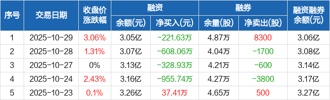 瑞泰新材融资融券信息显示,2025年10月29日融资净偿还221.63万元;融资余额3.05亿元,较前一日下降0.72%。