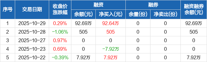 融资方面,当日融资买入206.18万元,融资偿还113.53万元,融资净买入92.64万元。融券方面,融券卖出0份,融券偿还0份,融券余量0份,融券余额0元。融资融券余额合计92.69万元。