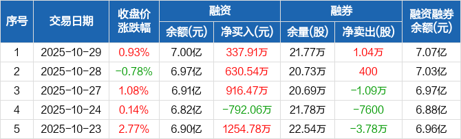 融资方面,当日融资买入4693.51万元,融资偿还4355.6万元,融资净买入337.91万元,连续3日净买入累计1884.92万元。融券方面,融券卖出1.12万股,融券偿还800股,融券余量21.77万股,融券余额613.26万元。融资融券余额合计7.07亿元。