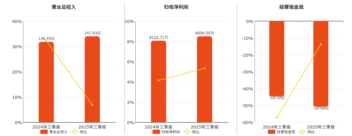 公司营业总收入为147.93亿元,在已披露的同业公司中排名第2,较去年同报告期营业总收入增加9.48亿元,实现5年连续上涨,同比较去年同期上涨6.85%。归母净利润为9609.55万元,在已披露的同业公司中排名第7,较去年同报告期归母净利润增加486.84万元,实现2年连续上涨,同比较去年同期上涨5.34%。经营活动现金净流入为-20.80亿元。