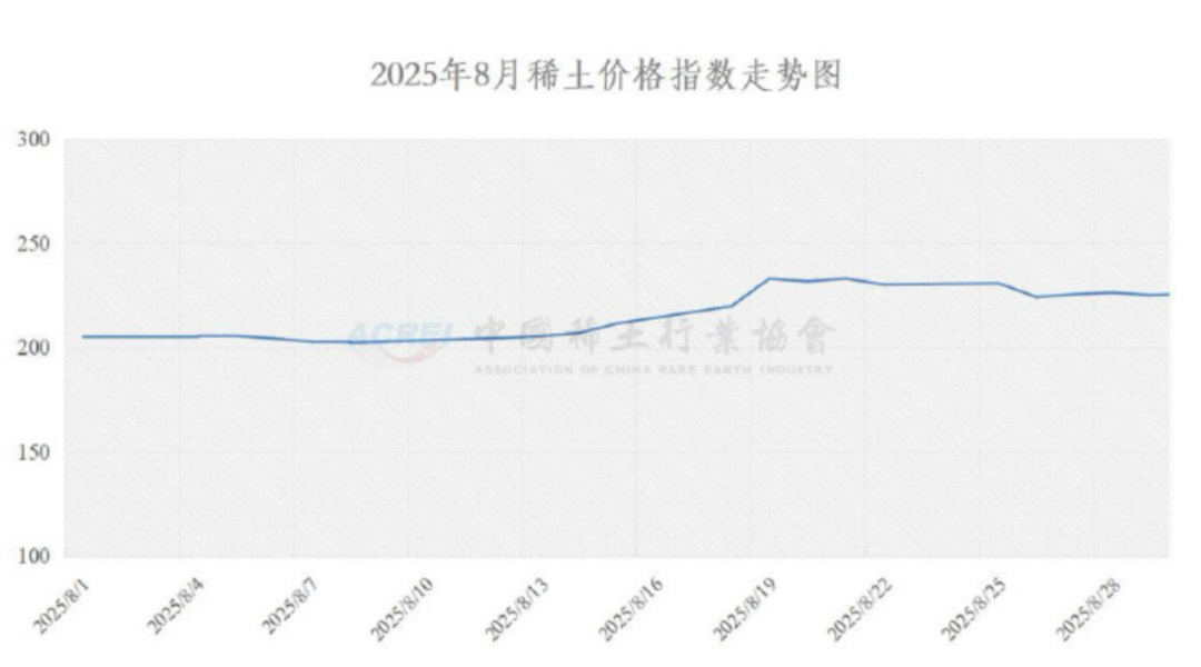 稀土市场正显现回暖迹象,以中国稀土行业协会的稀土价格指数为例,今年7月和8月,该指数出现明显上行,8月中旬创下年内新高233.2点,比2024年末上涨近43%。