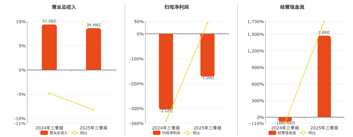 公司营业总收入为34.49亿元,在已披露的同业公司中排名第21。归母净利润为-1.20亿元,较去年同报告期归母净利润增加9176.65万元。经营活动现金净流入为2.69亿元,在已披露的同业公司中排名第20,较去年同报告期经营活动现金净流入增加2.85亿元。