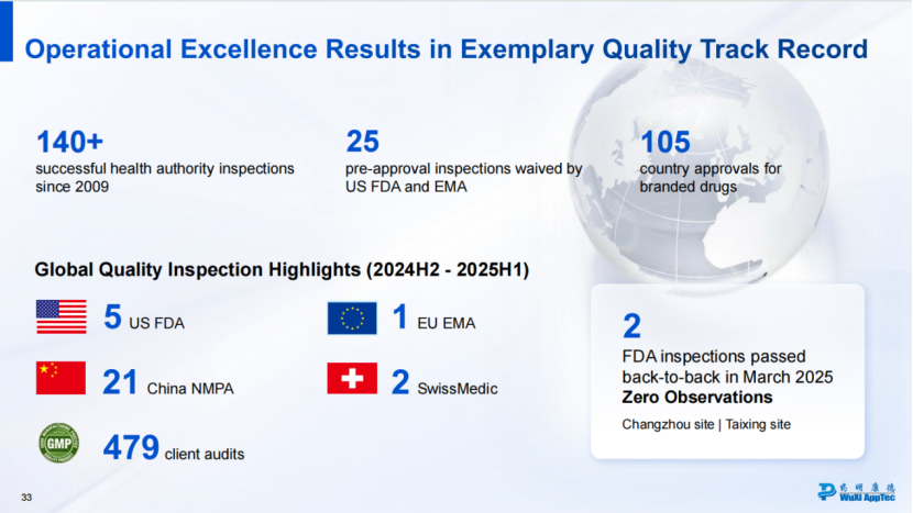 质量控制方面,药明康德通过“跨基地调派有经验团队+标准化培训”的双重保障措施,在加快新车间启动速度的同时,确保生产质量不打折扣。自2009年起,化学业务平台已接受超140次全球监管机构审计,25个商业化项目获得FDA、EMA“现场检查豁免”,这些成果既是全球监管机构对其质量标准的高度认可,也是极致运营能力的集中检阅。