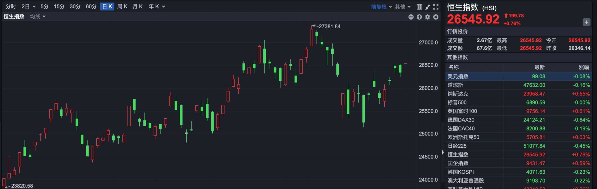 截至发稿,恒生指数开盘报26545.92点,上涨199.78点,涨幅0.76%。