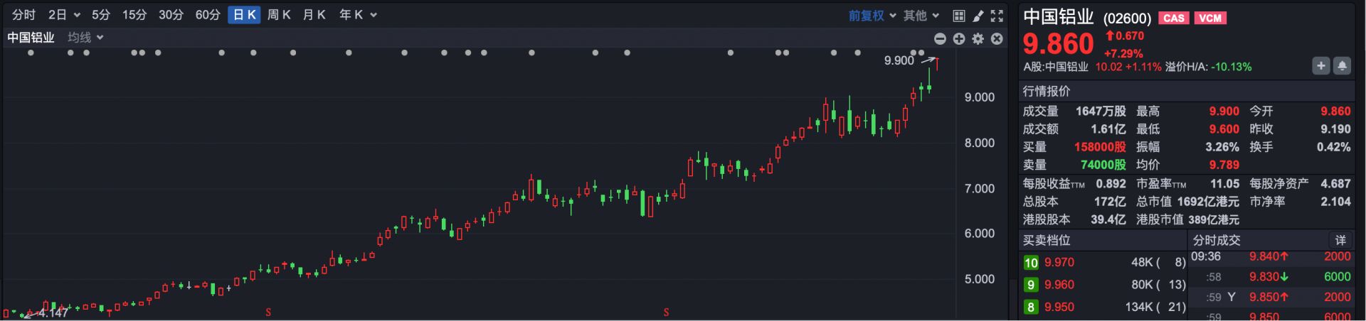 港股方面,有色金属板块再次走强。其中,中国铝业(02600.HK)、南山铝业国际(02610.HK)涨超7%,中国白银集团(00815.HK)、江西铜业股份(00358.HK)、北方矿业(00433.HK)、赣锋锂业(01772.HK)涨超6%,中国宏桥(01378.HK)涨超5%。此外,风电、煤炭、半导体等板块早盘涨幅领先。