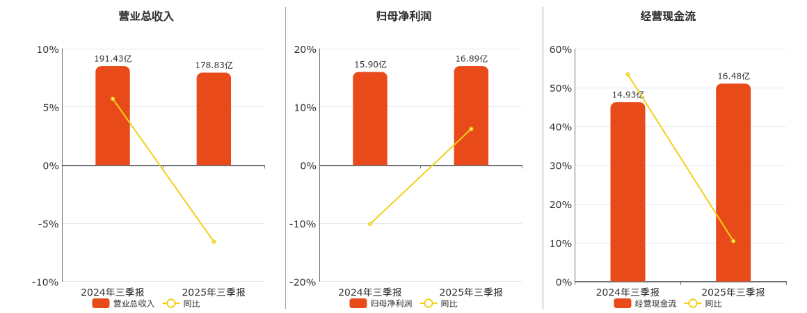 公司营业总收入为178.83亿元,在已披露的同业公司中排名第4。归母净利润为16.89亿元,在已披露的同业公司中排名第5,较去年同报告期归母净利润增加9888.21万元,同比较去年同期上涨6.22%。经营活动现金净流入为16.48亿元,在已披露的同业公司中排名第7,较去年同报告期经营活动现金净流入增加1.55亿元,实现4年连续上涨,同比较去年同期上涨10.40%。
