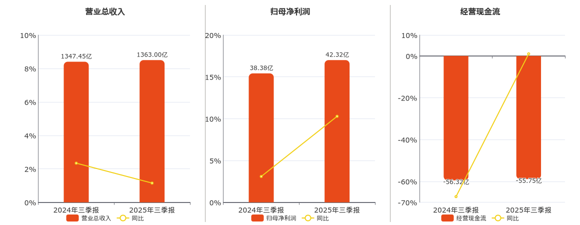 公司营业总收入为1363.00亿元,在已披露的同业公司中排名第1,较去年同报告期营业总收入增加15.56亿元,实现5年连续上涨,同比较去年同期上涨1.15%。归母净利润为42.32亿元,在已披露的同业公司中排名第1,较去年同报告期归母净利润增加3.95亿元,实现5年连续上涨,同比较去年同期上涨10.28%。经营活动现金净流入为-55.75亿元,较去年同报告期经营活动现金净流入增加5649.02万元。