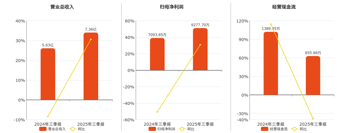 公司营业总收入为7.36亿元。归母净利润为9277.70万元。经营活动现金净流入为855.88万元,较去年同报告期经营活动现金净流入减少534.07万元,同比较去年同期下降38.42%。