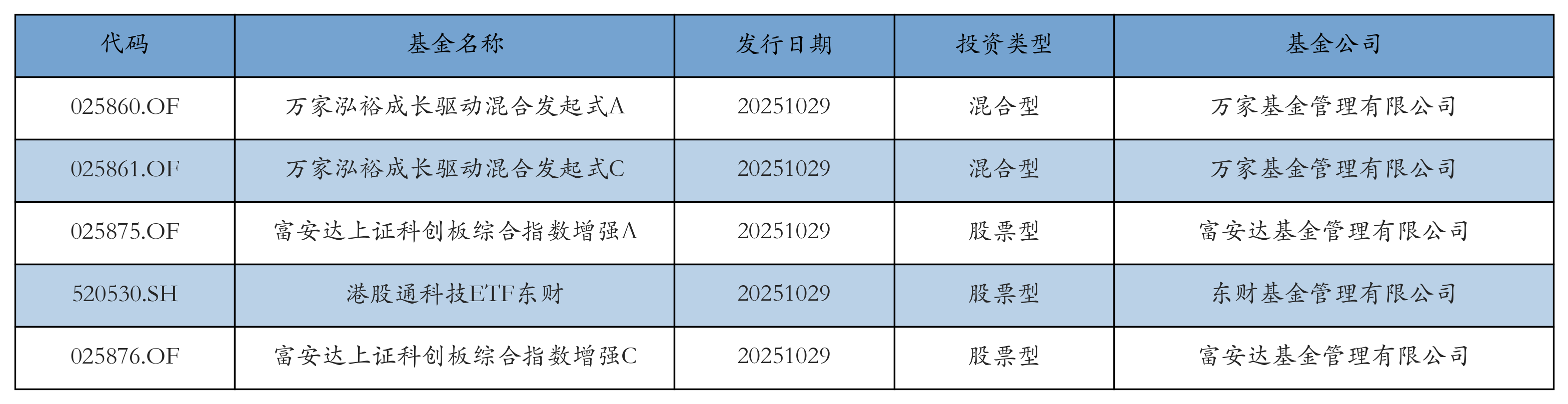 昨日有5只新基金发行,分别为:万家泓裕成长驱动混合发起式A、万家泓裕成长驱动混合发起式C、富安达上证科创板综合指数增强A、港股通科技ETF东财、富安达上证科创板综合指数增强C,详情见下表: