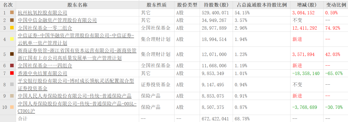 公告显示,十大流通股东中,三季度杭氧股份新进三家机构投资者。包括社保机构全国社保基金一一四组合,中信证券-中国华融资产管理股份有限公司-中信证券-云帆单一资产管理计划、中国人民人寿保险股份有限公司-传统-普通保险产品。